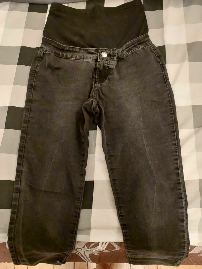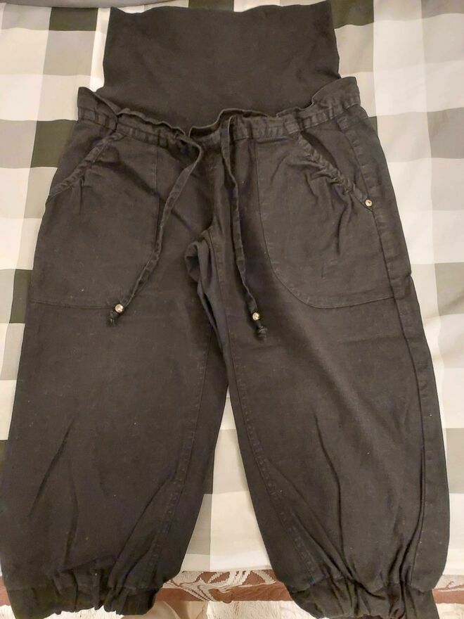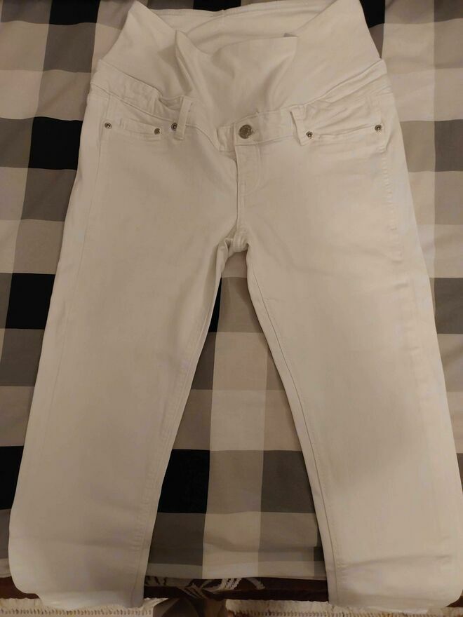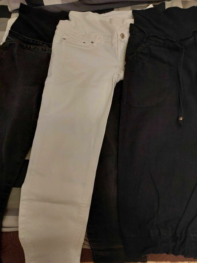 Sprzedam 3 pary spodni ciążowych różnych marek m.in H&M, Bandia. 2 pary spodni jeansowych w rozmiarze 38 w kolorze białym i czarnym a jedne rozmiar S kolor czarny 3/4 długości nogawki. Dodatkowo dorzucę poduszkę ciążową typu rogal z zdejmowanym pokrowcem.Mogę sprzedać same spodnie za 10 zł.